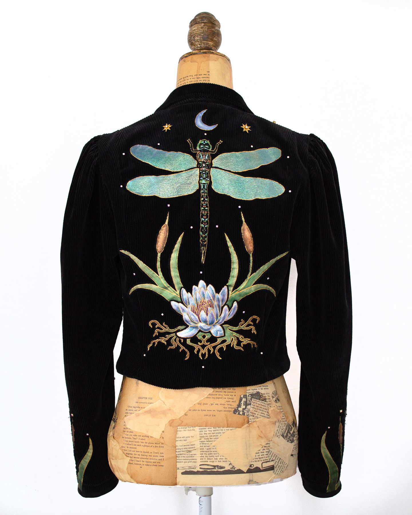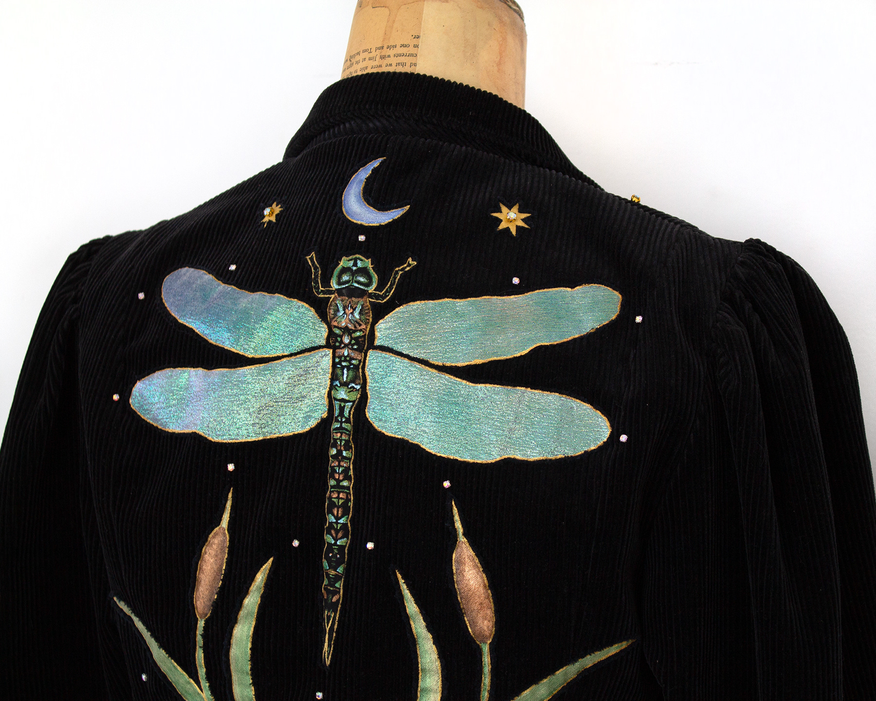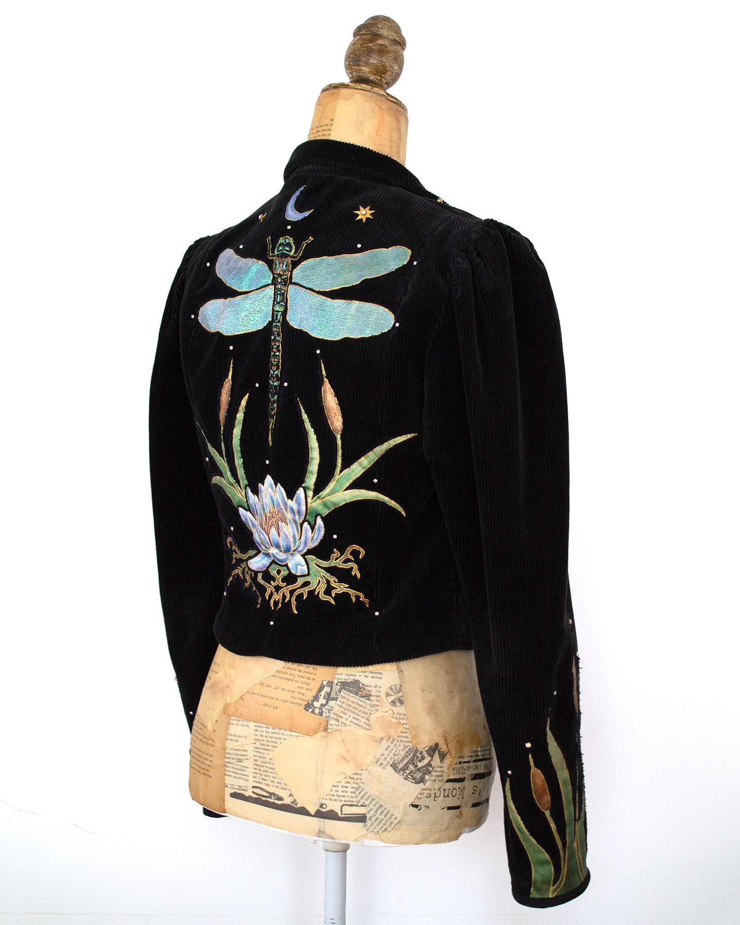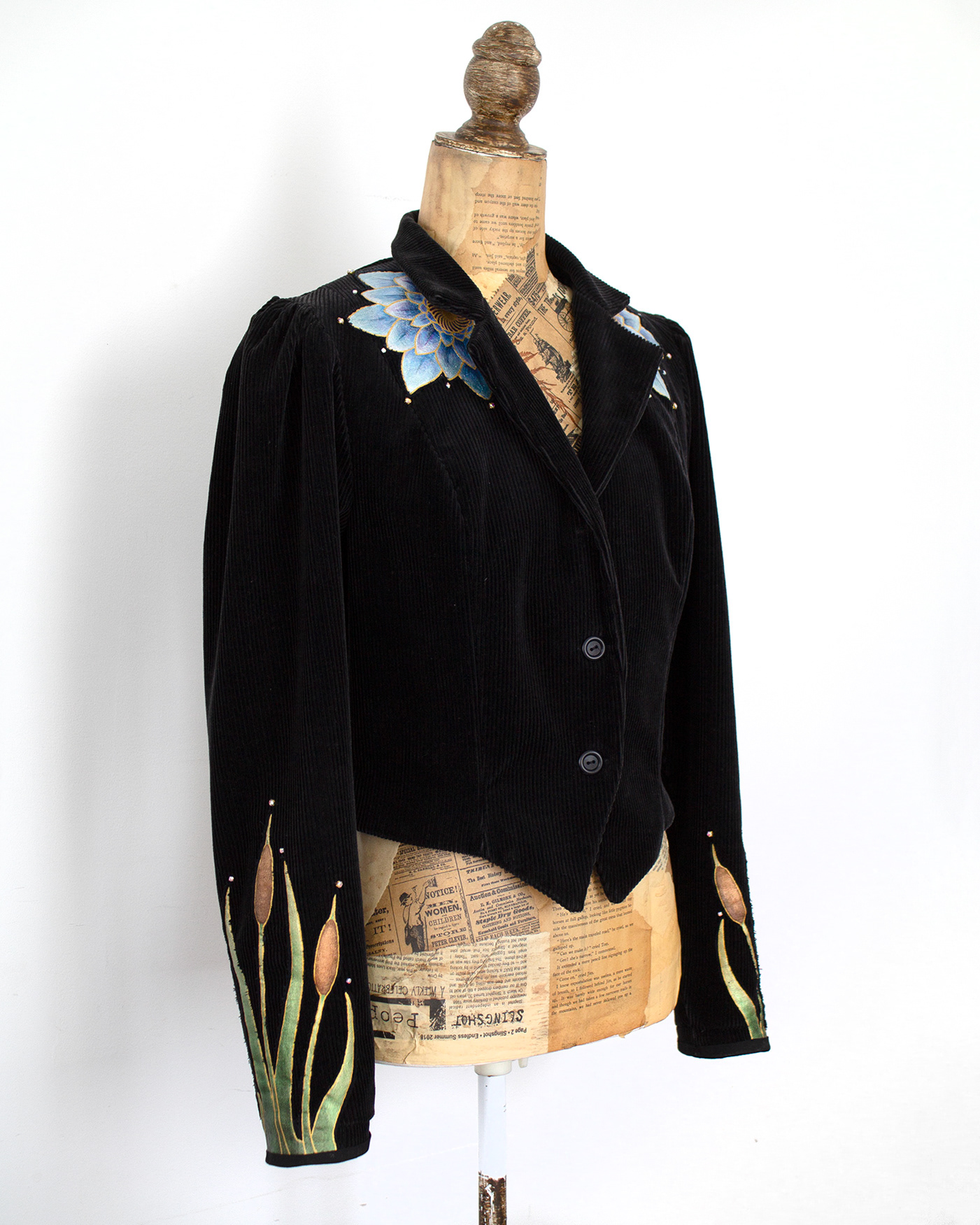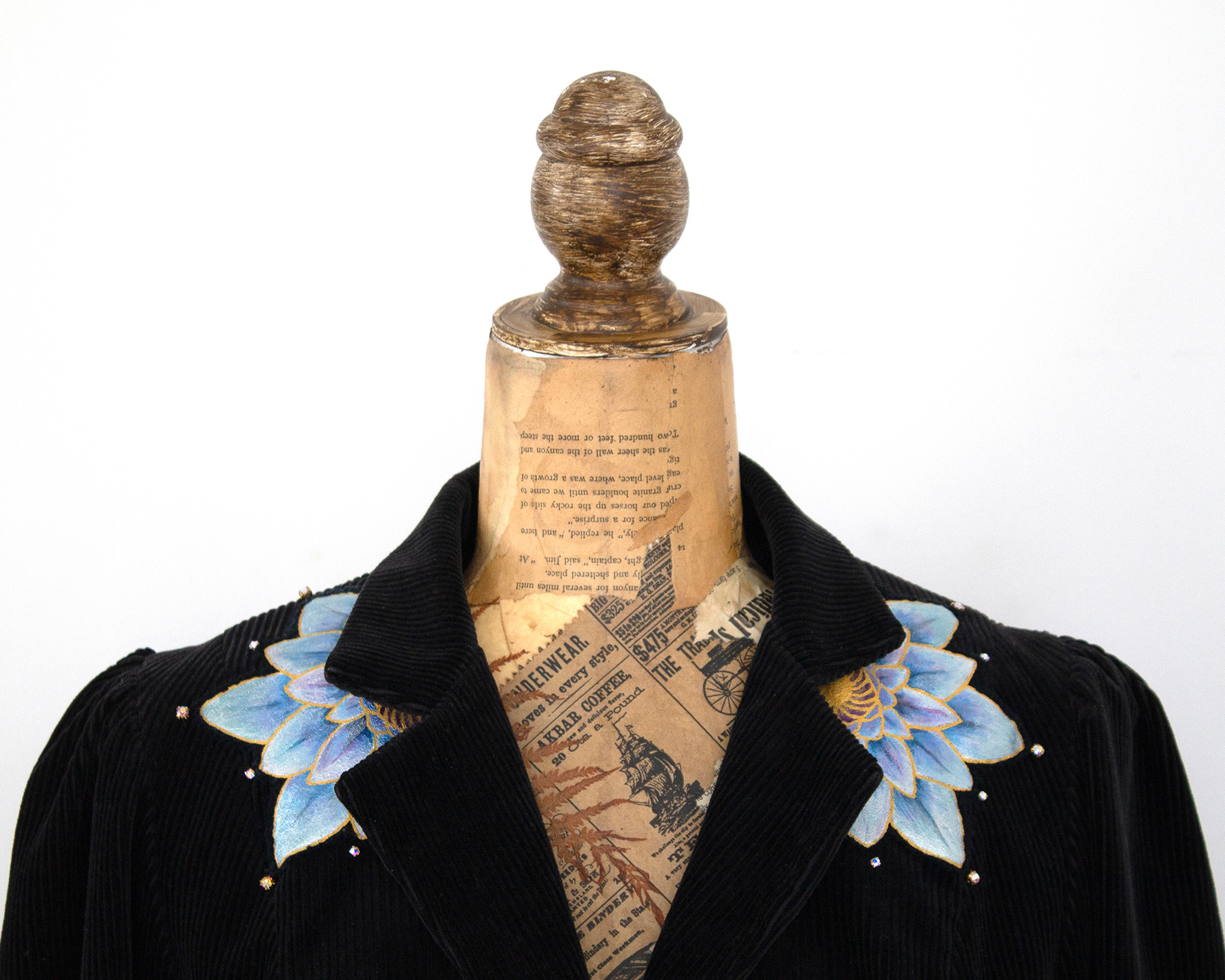 Hand painted appliqué, mesh fabric, and crystal beads on vintage corduroy jacket.